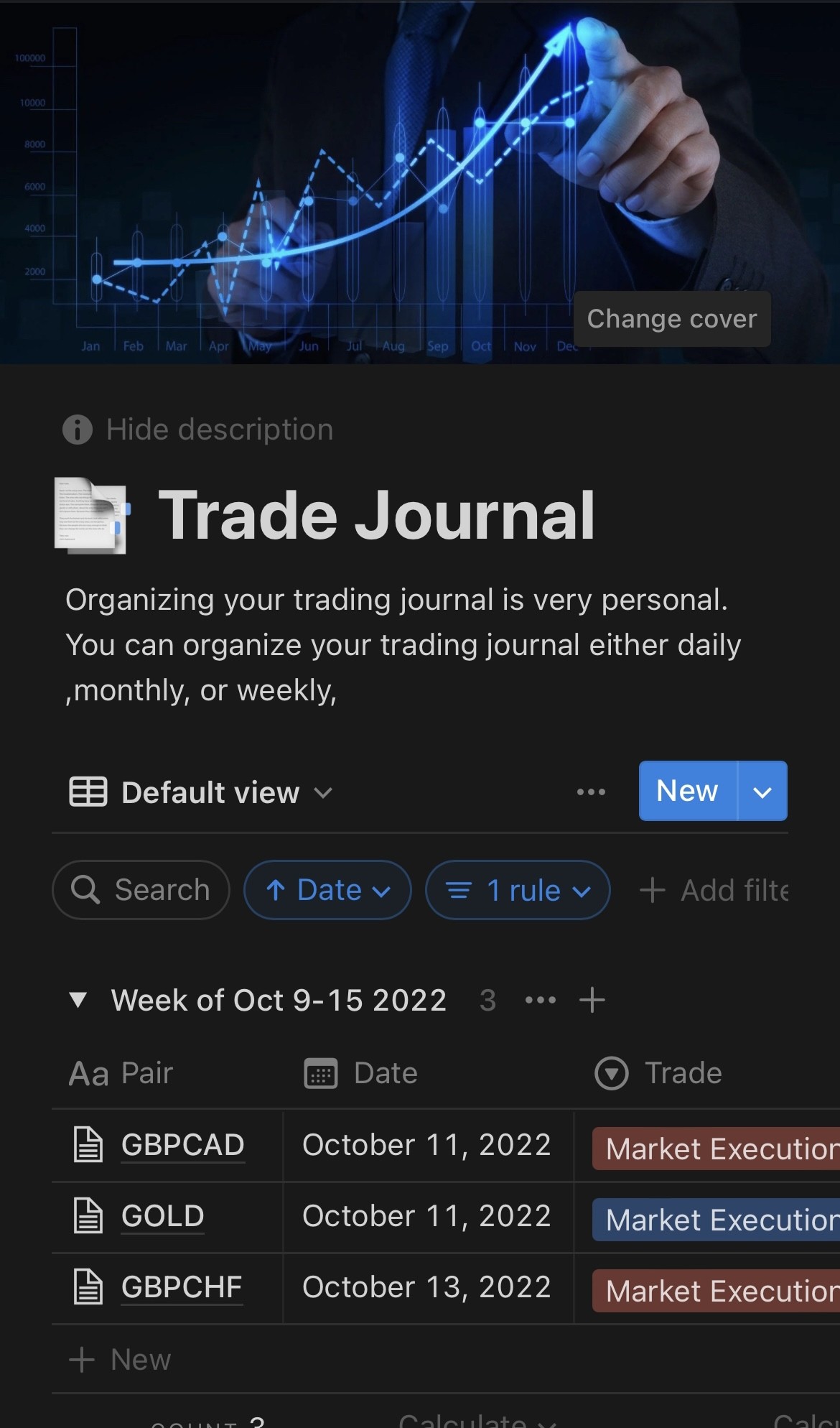 You will find inside this Notion, templates for outlining your trading goals & trading plan, a detailed area for your trading journal in order to collect with ease your trades so you can learn from them efficiently. There are sections to collect data such as patterns and any other key findings in your back testing. Also sections for daily, weekly & monthly reflections. Using smart data bases to review each particular instrument and month separately. On top of this we have included online tools such as, currency strength meter, volatility indicators and more.
